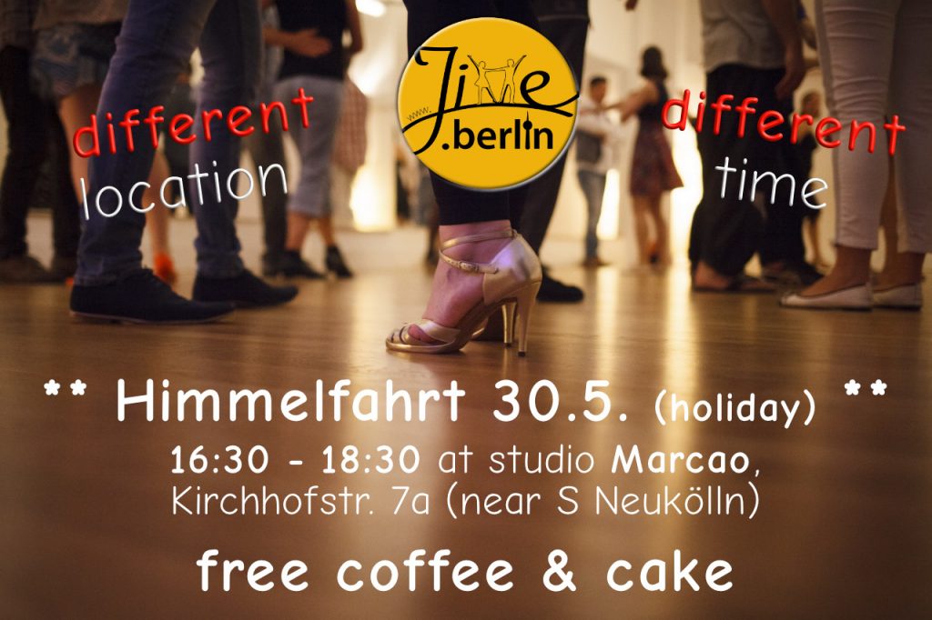 am Donnerstag, 30. Mai, ist Feiertag und unser „normales“ Studio leider belegt. Wir haben aber eine andere Location für euch gefunden! Und weil Feiertag ist, tanzen wir auch etwas früher als normal – mit Kaffee und Kuchen (kostenlos)…