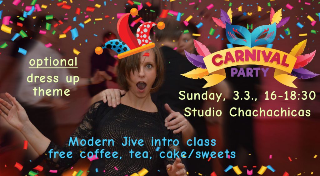 AnfängerInnen gern willkommen. Zu Beginn gibt es einen kurzen Modern Jive Einführungskurs und dann ist Zeit für Üben/Tanzen, Unterhaltungen, Kaffee, Tee…