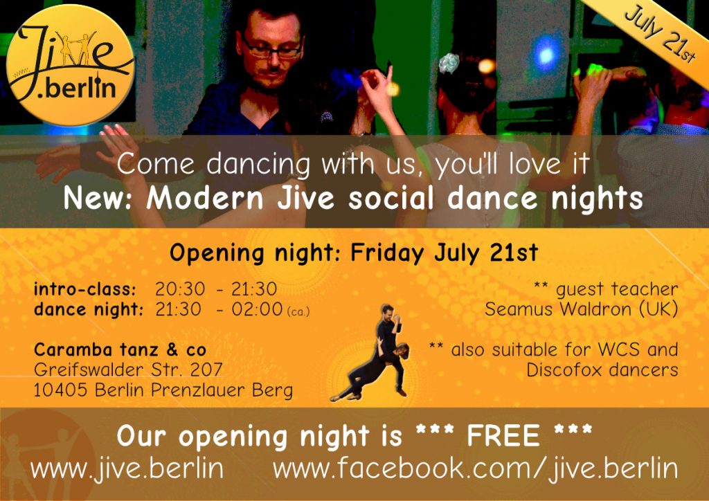 Gute Neuigkeiten! Wir werden ab Juli einen monatlichen Modern-Jive-Tanzabend durchführen! Es gibt jeweils eine kurze Einführungsstunde in Modern Jive – danach ist reichlich Zeit für’s Üben/Tanzen und gemütliche Beisammensein.